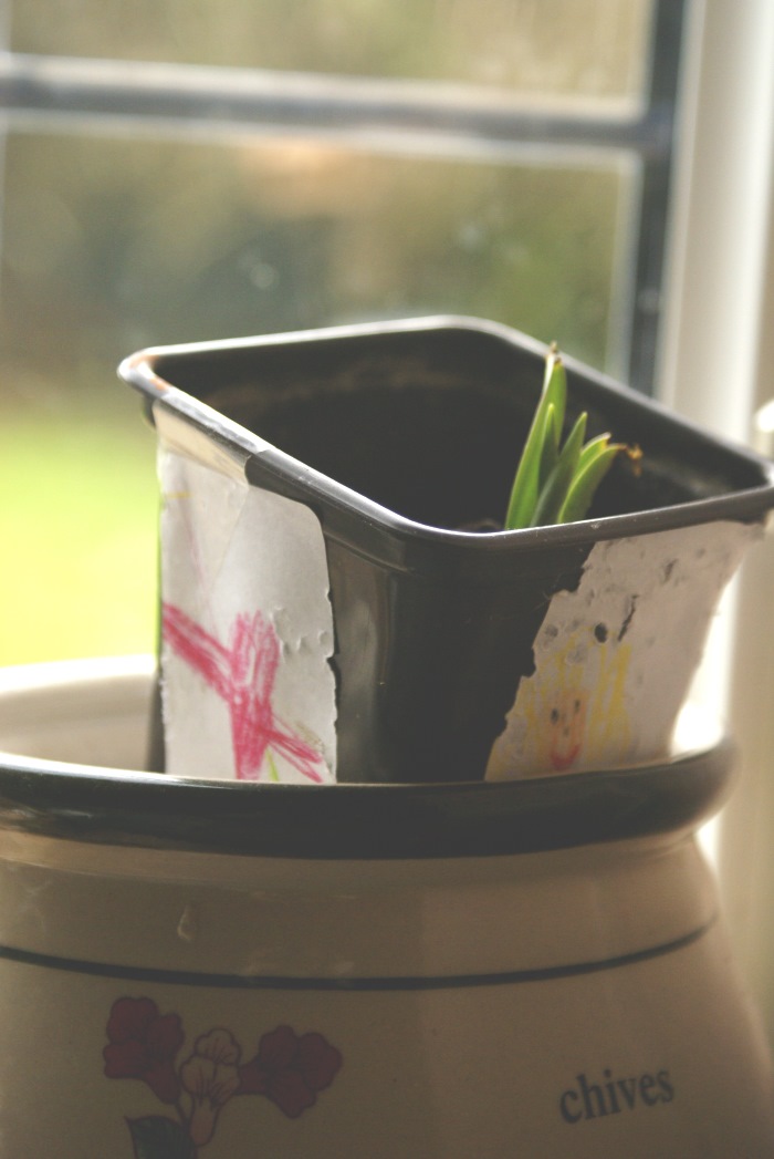 | Nola's mothers day bulb is growing in the sunlight on the kitchen windowsill. She waters it diligently and with great care and sincere love. She is clearly better at keeping houseplants than I am. |
